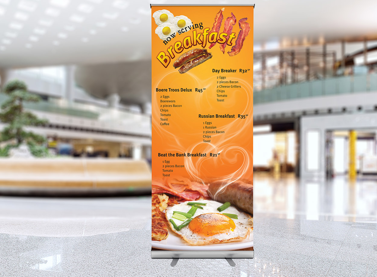 Breakfast banners designed for Mirage Motors in Britstown for the launch of their breakfast service. Apart from this, we've also designed their take-away restaurant menu.
